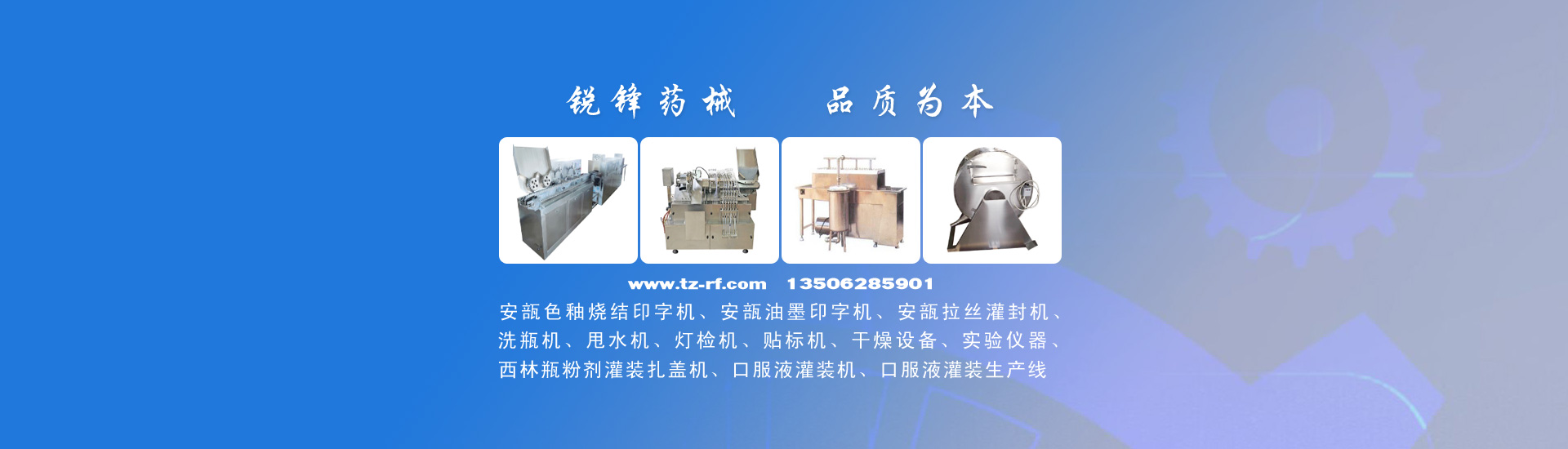 公司主要產(chǎn)品有:安瓿色釉燒結(jié)印字機(jī)、安瓿油墨印字機(jī)、安瓿拉絲灌封機(jī)、西林瓶粉劑灌裝機(jī)、洗瓶機(jī)、安瓿甩水機(jī)、燈檢機(jī)、貼標(biāo)機(jī)、口服液灌裝機(jī)、口服液灌裝生產(chǎn)線、制藥機(jī)械、干燥設(shè)備、實(shí)驗(yàn)儀器等,并可根據(jù)客戶(hù)要求非標(biāo)定制生產(chǎn)。產(chǎn)品廣泛用于制藥、食品、保健品、化妝品等行業(yè)。